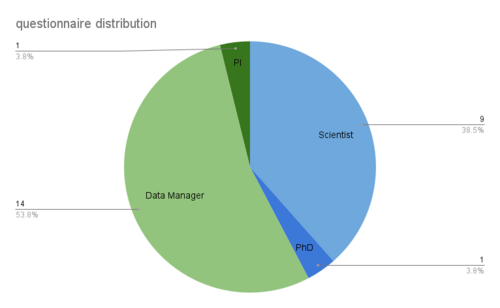 Overall we asked 25 people whereas 9 were Scientist and 14 classified themselves as Data Manager (in a broad sense, including repository staff and data stewards). One PhD Candidate was attributed to the Scientist and one PI to Data Manager which gave us a reasonable distribution of the different questionnaire sections.