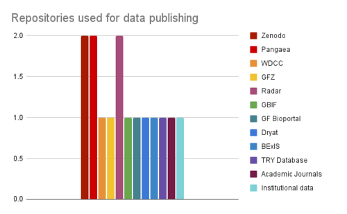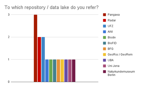 We asked the Scientists [A1] whether they publish data and if so, where and if not, why respectively. Out of 10 people only 2 did not publish data, the reason being ‘no time’ and ‘no need currently’. Repositories used for data publishing are widely spread ( multiple responses were possible) as are the metadata standards used (Datacite, ISO 19115/19139, INSPIRE, OGC sensor, Geonames, DarwinCore, ABCD, CF, ops4mips, archiveSS and project specific).