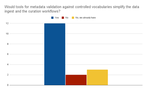 For Data Managers, the distribution across institutions/repositories is widespread as well. For our first question [B1] “Would tools for metadata validation against controlled vocabularies simplify the data ingestion and the curation workflows?” 12 participants responded with “Yes”, the other 3 persons claimed to have already automated workflows. However, here too, the answer “yes” was sometimes emphatically emphasized (“of course”, “certainly”). The second question [B2] “Are you looking for ways to automate your data quality assurance?” was answered by two-thirds of respondents with “Yes”. One-third responded with “No” but of those 3 were claiming that workflows for automated data quality assurance already exist. Interestingly, within the group of “Yes” some participants stated that even though they already have data quality mechanisms those could and should be improved (which is why they answered with “Yes”). The range for the follow-up question in which areas data quality assurance could be improved spans from “tools for term definition and standards”, “cross-quality checks” and “statistics and error dealing” to “tools for extracting metadata from papers”. Our final question [B3] “Are you concerned about the lack of standardisation in your repository / data lake asset?” shows no clear message: even though most participants do not recognise a lack of standardisation we got many restricting answers such as “no but curation is needed”, “not for published data but definitely for internal data”, “not for my repo, but certainly in general”, “no but curation and maintenance is an issue" or “no but there is much room for improvement”.