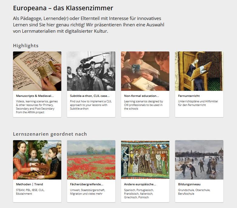 Für Pädagogen, Lernende oder Eltern bietet Europeana eine Auswahl von Lernmaterialien (viele davon in englischer Sprache) mit digitalisierter Kultur – die Europeana Lernszenarien.
